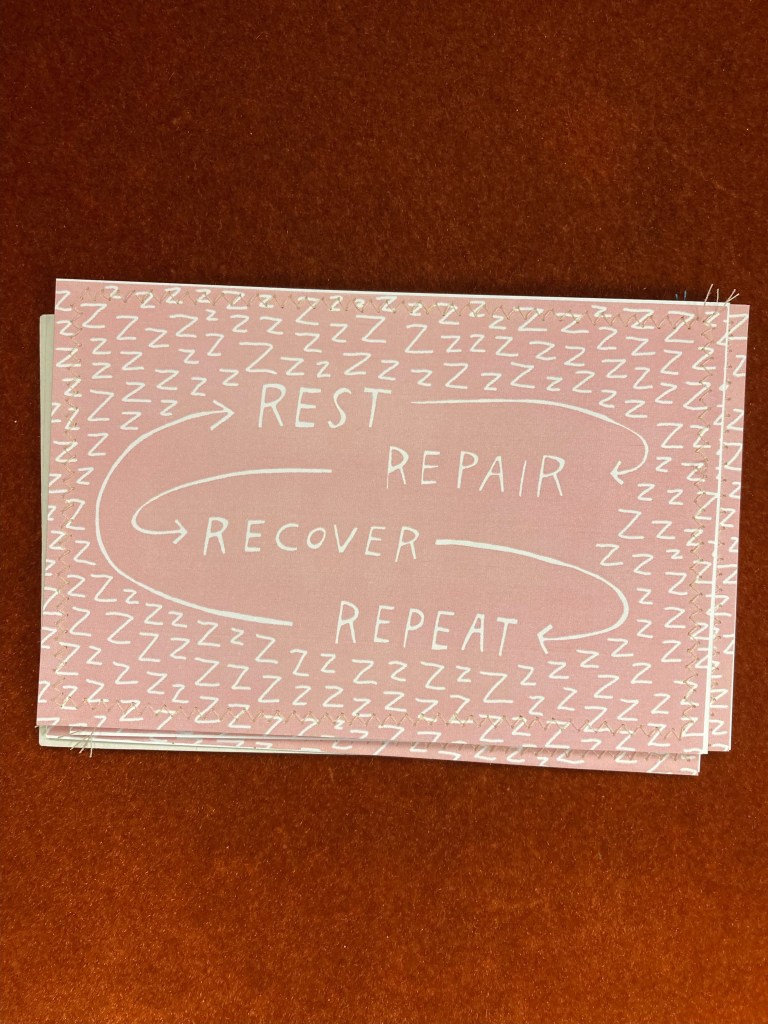 I have slowly been returning to a more normal routine. I still have limitations on lifting heavy things, doing intense housework, and on doing some exercises. I’m feeling eager to return to some of those regular kinds of tasks (postcards of the month still went out!) but I’m also content to test the limits and then realize I am tired and simply lay down and rest for an hour or two. I can’t believe I have the privilege of having this nap role model to lay across my legs encouraging me to to rest, repair, recover, repeat: