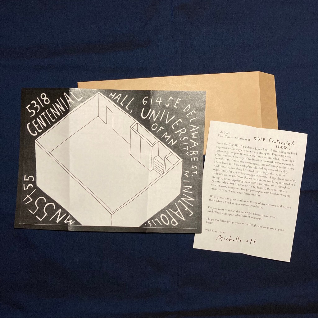At the beginning of the COVID-19 pandemic began I culled my lived experiences for ways to connect to strangers. Practicing social distancing, my part time jobs shuttered or cancelled, sheltering in place, and the necessity of confronting financial precariousness provoked me into active reminiscing, and reflecting on the places I have lived and how each place affected my sense of stability. Perhaps I was simply missing places and people more acutely while I did not have access to them. Although I certainly wished to see family and friends in person again, phone and video calls allowed me to connect with them meaningfully. What I realized was strikingly absent, was the opportunity for me to be a stranger to someone. My effort to recover (or replenish?) these encounters is called Current Occupant. The project began with hand drawing my memory of each residence I have lived in. This image and a letter was then sent to the current occupant of each address, a complete stranger to me. The endeavor is an offering, an autobiography, a memory palace, and an ode to that which exists only in memories.